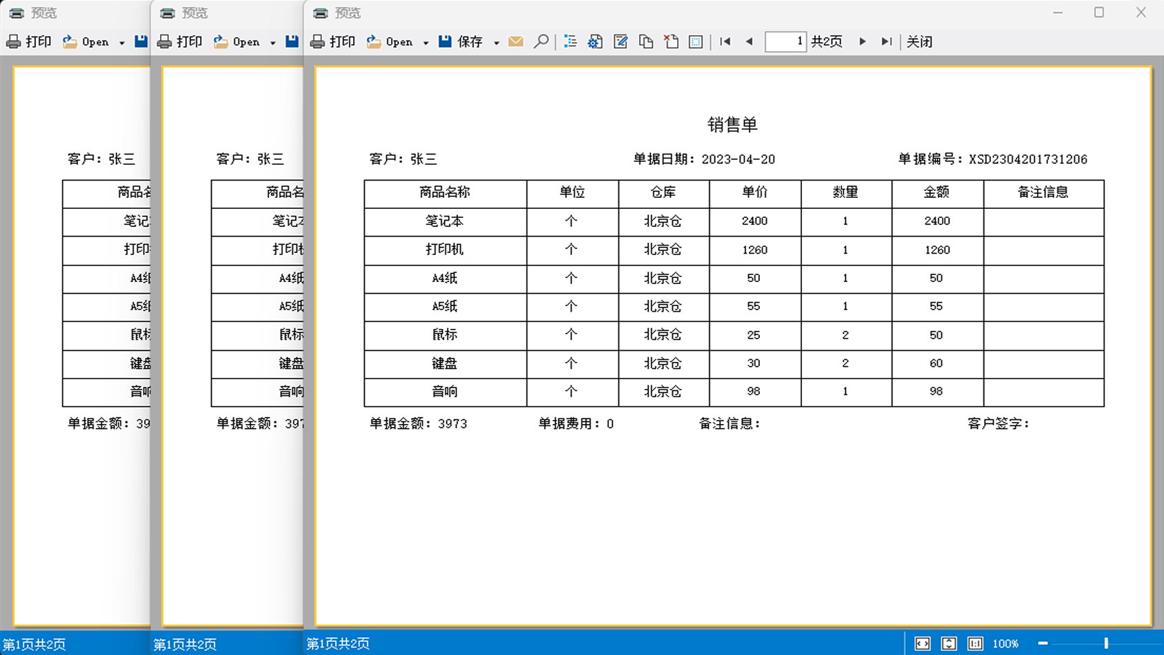 支持单据多样式的直接打印、预览报表,输出PDF、可视化模板设计。